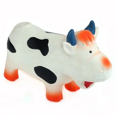 Latexová kravička bučící (chrochtající), plněná dutým vláknem pro větší odolnost.