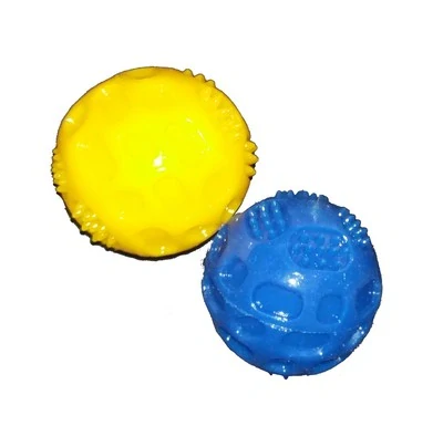 Míček z odolné termoplastické pryže s reliéfem, pískací. Ve dvou barvách (žlutá a modrá) dle dostupnosti skladu.