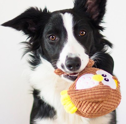 Sovička z velmi jemného plyše, s plochými šustícími křidélky, za které ji mohou tahat a nosit i velmi malí pejsci nebo štěňátka. Plněná dutým vláknem, s pískátkem v těle.
