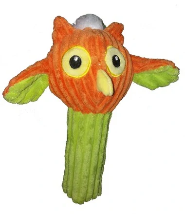 Plyšová sovička s peškem místo těla a šošolkou, tělo plněné velkým válečkovým pískátkem, hlavička plněná dutým vláknem, ukrývá klasické menší polštářkové pískátko. Díky tvaru se pejskům hezky drží a nosí. Vhodná pro střední i větší pejsky.