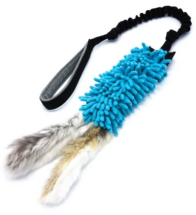 Přetahovadlo "mop" se dvěma králičími kožešinovými cípy, s pružnou rukojetí (amortizérem) pro pohodlnější přetahování. Uvnitř mopové části je ukryté pískátko.