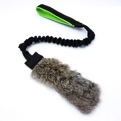 Přetahovadlo s pravou králičí kožešinou, po celé délce prošité popruhem pro větší odolnost, s delší pružnou rukojetí (s amortizérem) pro příjemnější přetahování.
