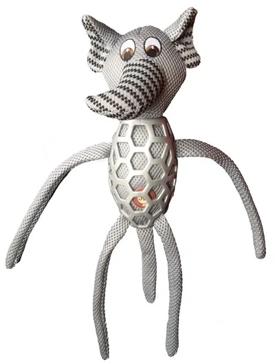 Textilní slon s dlouhýma nohama a s krunýřem z termoplastické gumy, tělíčko a hlavička plněná dutým vláknem, nohy neplněné, v břiše pískátko.