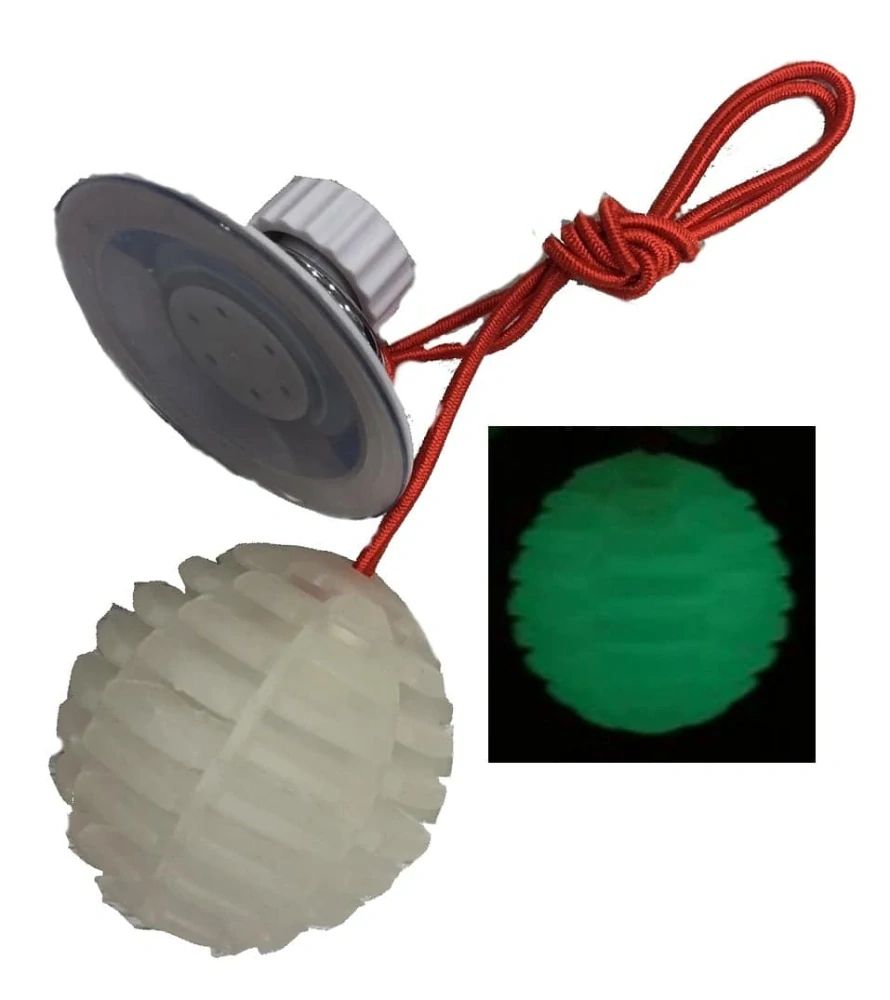 Fosforeskující míček na úzké pružné gumě. Díky přísavce lze připevnit na hladkou plochu a pejsek si tak může vyhrát dobře i sám. Přísavku lze snadno odšroubovat a míček používat samostatně jen na gumě, pro aportování a házení - neztratíte ho ani po setmění, protože je ve tmě fosforeskující.