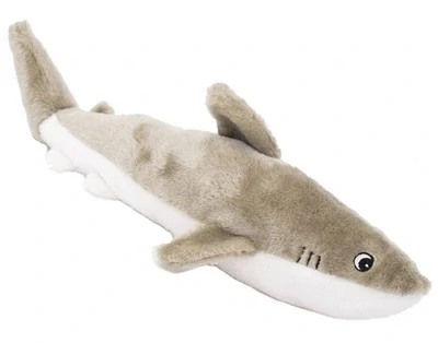 Velký plyšový žralok plněný dutým vláknem, s dlouhým válečkovým pískátkem typu "harmonika", které vyplňuje většinu těla.