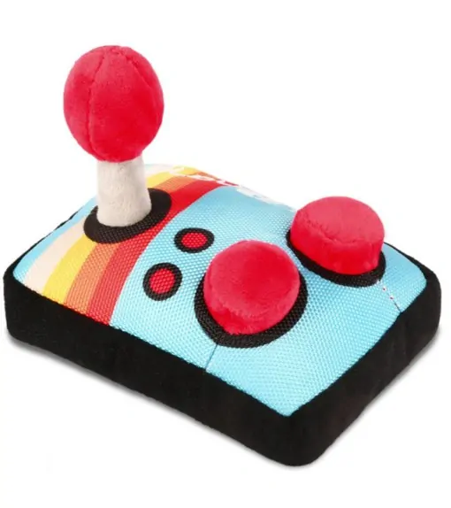 Zajímavá netradiční hračka - plyšový joystick, s velkým obdélníkovým pískátkem, které tvoří vnitřek celé hračky, ovládací páčka vyplněná lanem, aby dobře držela.