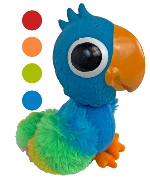 Veselý barevný papoušek s latexovou hlavičkou a plyšovým tělem. Hlava je pohyblivá, s pískátkem, tělíčko také pískací, se šustícím ocáskem. Různé barevné kombinace, dle aktuální dostupnosti skladu.