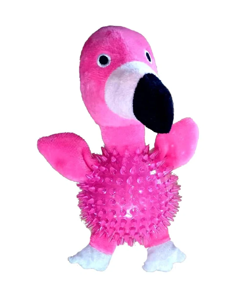 Plyšový plameňák, s tělíčkem schovaným v termoplastickém ježatém míčku, plněný, v hlavičce pískátko.