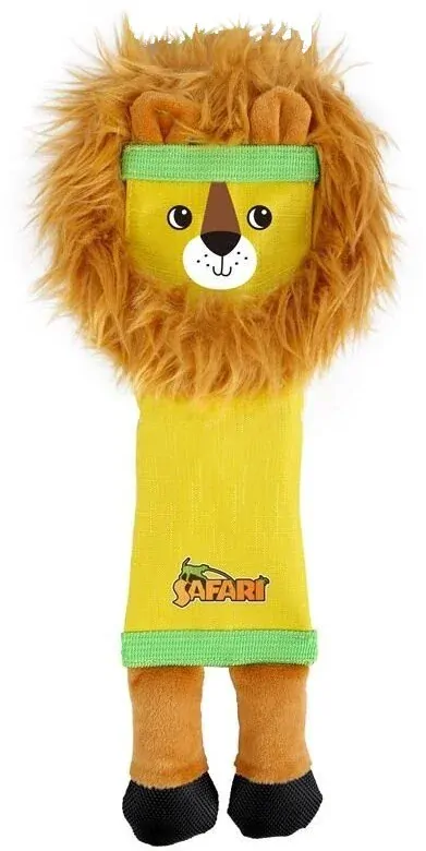 Odolný lev, vyrobený z materiálu požární hadice, se zpevněnými švy. Plněný jen velkým oválným pískátkem, s plyšovou hřívou a nožkami, šustícíma ušima