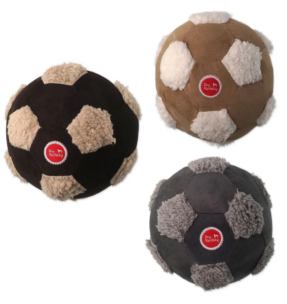 Větší plyšový míč, plněný dutým vláknem, s malým polštářkovým pískátkem.